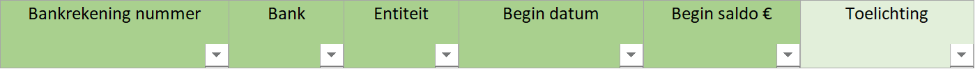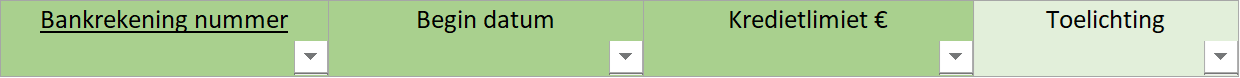 - Kredietlimiet €: Vul een negatief bedrag in voor de kredietlimieten per bankrekening en per periode. Wordt een kredietlimiet beëindigt, vul dan 0 in per beëindigingsdatum (dit is dus op Begindatum van de beëindiging).