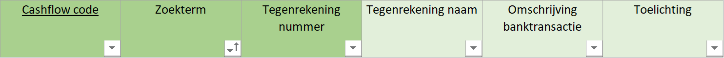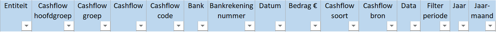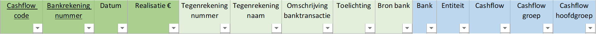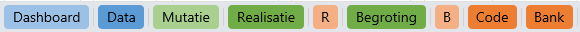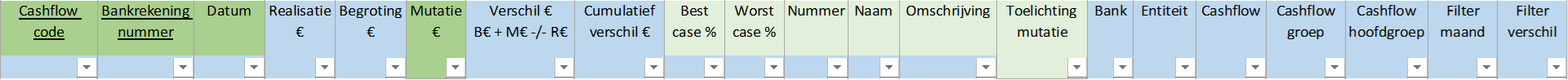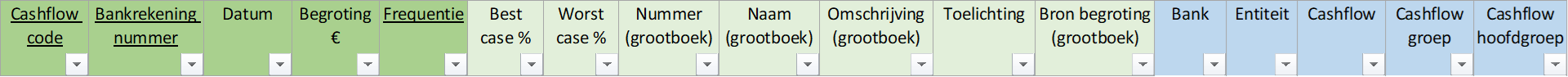 - Cashflow groep: 2e aggregatie niveau. De namen komen uit de verplichte standaard validatielijst (de kolomnaam is onderstreept = validatie) en worden gebruikt in de rapportage (o.a. bij Dashboard en Data). De groepsnamen zijn: ontvangsten; uitgaven; buitengewoon; belasting; investering; desinvestering; hoofdsom; aflossing en rente.