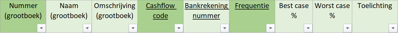 - Cashflow hoofdgroep: 3e aggregatie niveau. De namen komen uit de verplichte standaard validatielijst (de kolomnaam is onderstreept = validatie) en worden gebruikt in de rapportage (o.a. bij Dashboard en Data). De hoofdgroepsnamen zijn: exploitatie; investering en financiering.