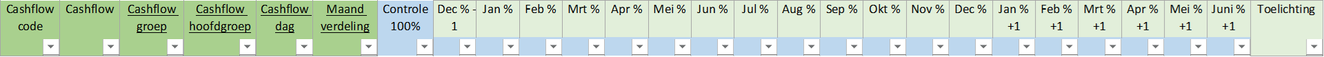 - Cashflow codes: onbeperkt met eigen naam in te voeren. Maar ons advies is "less is more": hou het overzichtelijk (niet te veel detail). Focus op de belangrijkste en grote cashflows.