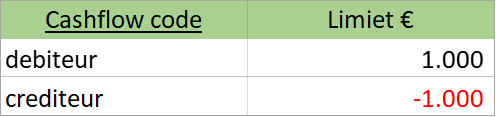 - Kredietlimiet €: Vul een negatief bedrag in voor de kredietlimieten per bankrekening en per periode. Wordt een kredietlimiet beëindigt, vul dan 0 in per beëindigingsdatum (dit is dus op Begindatum van de beëindiging).